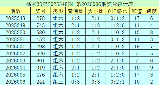 上期归来:福彩3D第2026006期开奖号码为244,组选类型为组三,奇偶比为0:3,大小比为0:3。