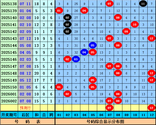 后诀别析:上期后区为一奇一偶号码07+08,最近10期后区号码奇偶比为9:11,最近50期后区奇偶比为47:53,本期后区参考一奇一偶组合,包涵两码07、12。