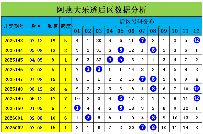 后区上期开出号码07、08,奇偶比为1:1,近十期后区奇偶比为9:11,总体看偶数走势稍热,本期后区要珍爱奇偶比1:1,五码复式参考:01 03 06 10 12,要点两码保举:03 10