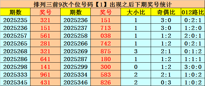 个位号码:上期奖号为小 号、奇数、1路号码:1,历史上个位号码1共开出740期,前一次出刻下第2025345期,上期遗漏10期再出。