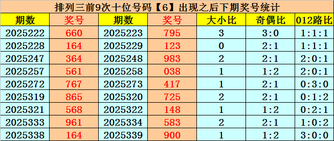 十位号码:十位上期开罕见数、小 号、0路号码:6,历史上十位号码6共开出737期,上一次出刻下第2025338期,上期奖号遗漏值为17期。