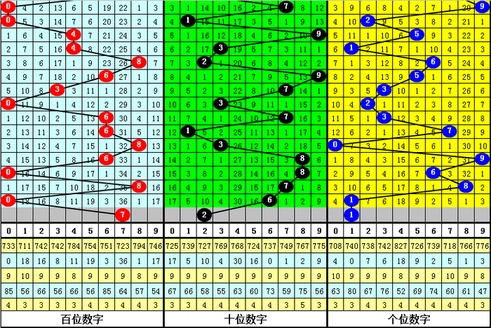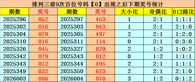 百位号码:百位上期奖号为0路、奇数、小 号:0,历史上百位号码0共开出733期,前一次开出期数在第2026003期,上期奖号隔1期再次开出。