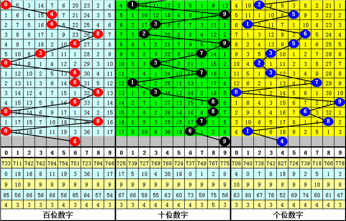 百位分析:该位上期开出号码0,最近10期该位012路比为8:0:2,其中0路号码停止1期再次出现,本期该位防0路号码再次出现,参考号码6。