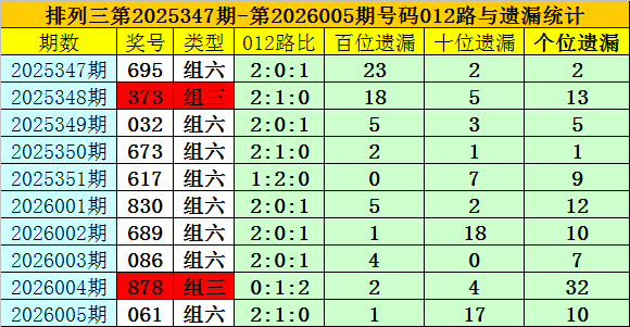 开奖转头:成列三第2026005期奖号为:061,类型为组六,号码012路比为2:1:0,百十个位号码直选差别遗漏1期、17期和10期。