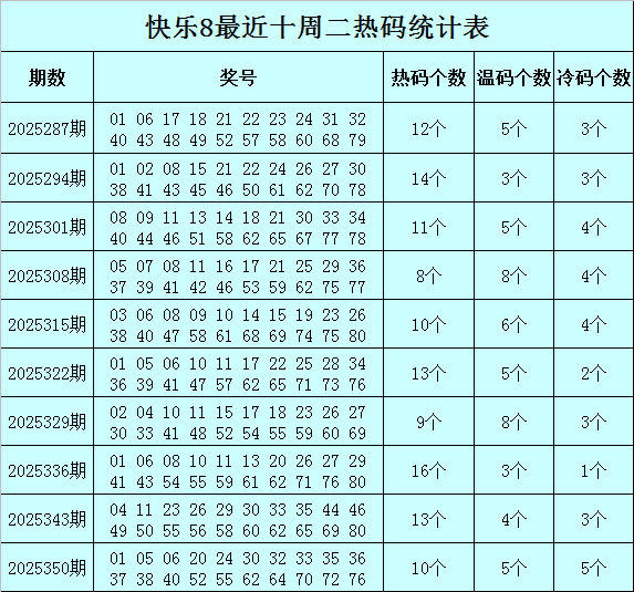 福彩欢乐8第2025350期(上周二)开奖转头:01 05 06 20 24 30 32 33 35 36 37 38 40 52 55 62 64 70 72 76,其中奖号遗漏总值为65,冷温热码比为5:5:10。
