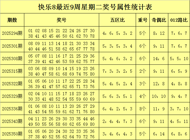 012路比分析:最近9周星期二奖号012路总比为51:54:75,最近3周星期二奖号012路总比为13:20:27,上周星期二奖号012路比为6:8:6。